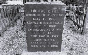 Tom Fife came to the United States of America on July 5th, 1866, at age 13 with his father, John. The pair worked their way across the country, in the coal mines of Pennsylvania, prospecting for gold in Wyoming, and for two years on the Salt Lake Temple, then under construction in Utah. In 1880, the census showed Tom Fife living in Almy, Wyoming, where he was reported to be 26 years old and working as a laborer.